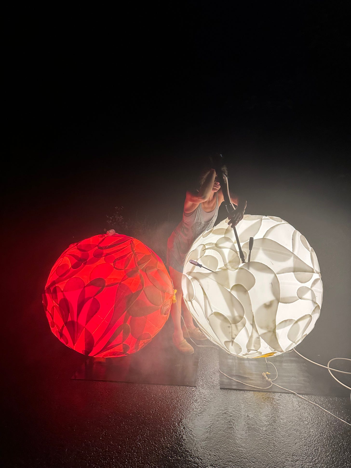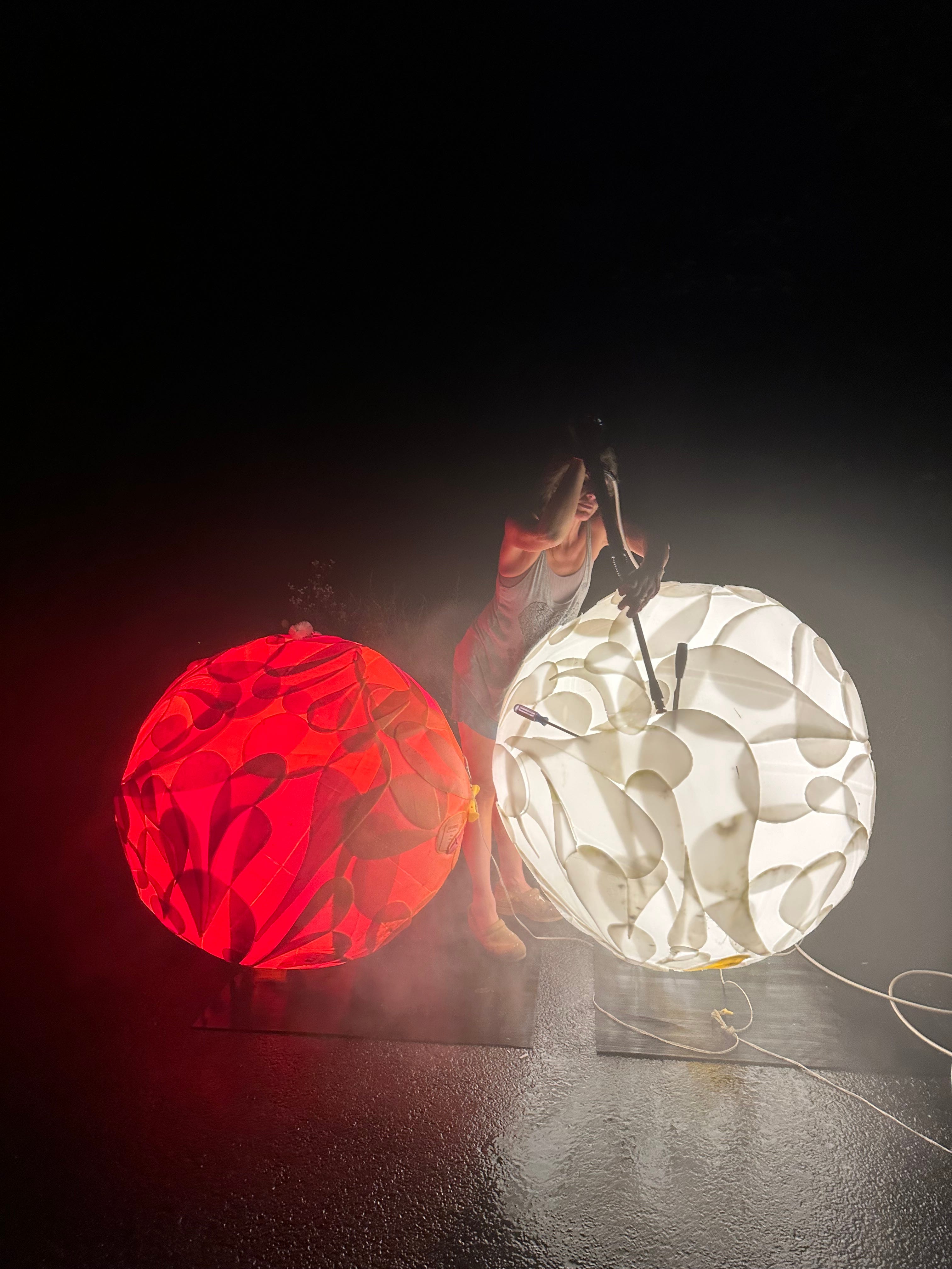 On the topic of creative problem solving, here is photograph Marshall Coles took of me powerwashing the Ding Dang before they went on their last public exhibition. Doing this task at night worked best because the internal lights helped me see where dirt or bugs accumulated in them after they were hanging around outside for a long period of time. It looks like I’ve grown a giant pair no? I can’t be the only one who thinks that is at least a little funny.